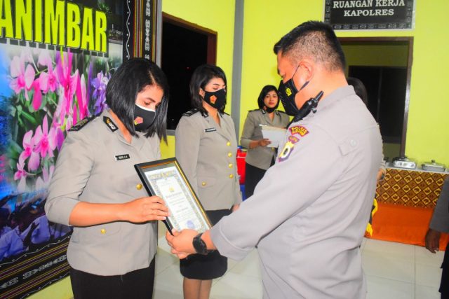 Dalam kegiatan dimaksud, yang dihadiri oleh seluruh personil Polwan Polres Kepulauan Tanimbar bersama Pengurus Bhayangkari Cabang Kepulauan Tanimbar, diberikan Penghargaan berupa Piagam oleh Kapolres Kepulauan Tanimbar kepada 2 (dua) personil Polwan berprestasi dalam pelaksanaan tugas yaitu Bripka Ventie O. Melsasail, jabatan PS. Kasie Dokkes Polres Kepulauan Tanimbar atas pelaksanaan tugas membantu Pemerintah dalam mensukseskan percepatan akselerasi Vaksinasi Covid-19 dan Briptu Paskalina Angwarmase jabatan Brigadir Sat Reskrim Polres Kepulauan Tanimbar, atas pelaksanaan tugas dalam kecepatan penanganan kasus tindak pidana perlindungan perempuan dan anak.