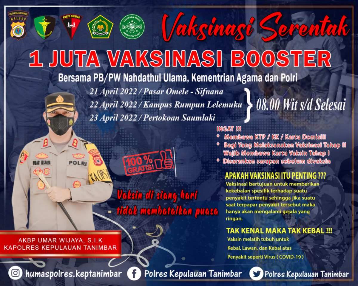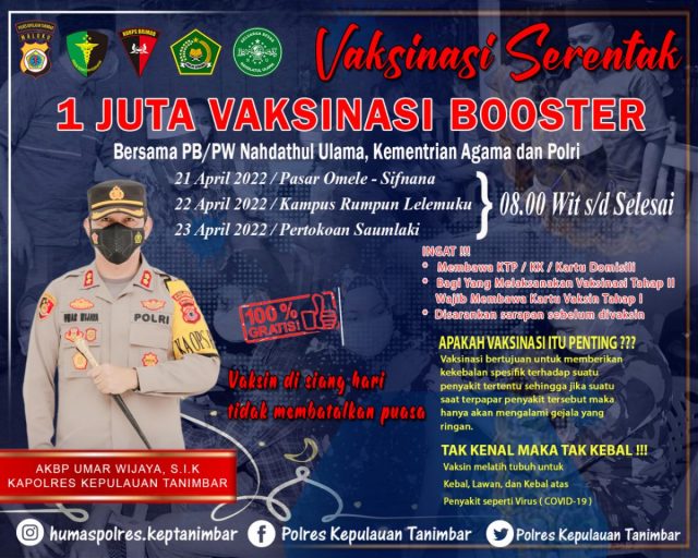 Kapolres Tanimbar melalui Kasi Dokkes Polres Tanimbar meghimbau kepada masyarakat di kota Saumlaki dan sekitarnya bagi yang belum divaksin, agar dapat mengambil kesempatan untuk memperoleh kekebalan individu melalui Vaksinasi Serentak tahap 1, 2 dan 3 yang akan dilakukan Polres Tanimbar mulai besok Kamis (21/04/2022) di Pasar Omele Sifnana, Jumat (22/04/2022) di Kampus Rumpun Lelemuku Saumlaki dan Sabtu (23/04/2022) di Pertokoan Saumlaki mulai pukul 08.00 wit s/d selesai dengan membawa KTP / KK / Kartu Domisili dan bagi yang melaksanakan Vaksin tahap II agar tidak lupa membawa kartu Vaksin tahap I dan bagi yang akan melakukan Vaksin tahap 3 jangka waktu vaksin sejak tahap 2 minimal 3 bulan.