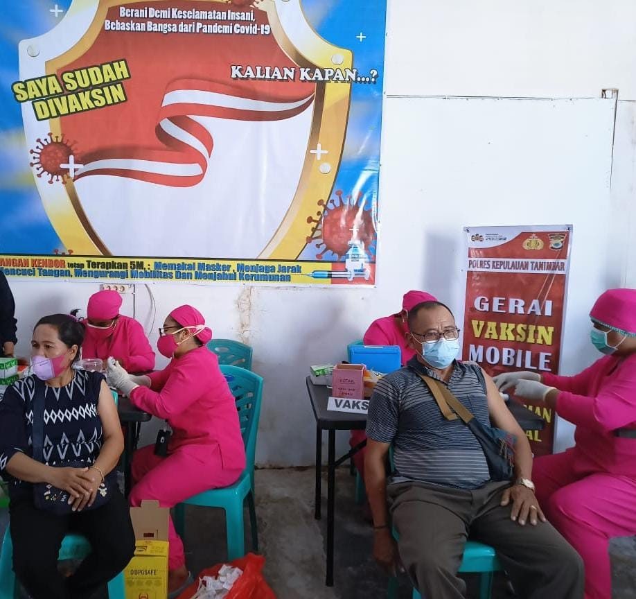 Kegiatan Vaksinasi mobile Polres Kepulauan Tanimbar berlangsung aman dan lancar dengan penerapan penuh Protokol Kesehatan Covid-19 yaitu masyarakat diwajibkan menggunakan masker, mencuci tangan dan menjaga Jarak serta tidak berkerumun pada saat mengantri untuk mendapatkan Vaksinasi.