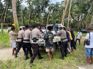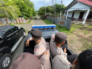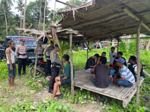 Disamping memberikan Imbauan dan pesan Kamtibmas, secara tiba-tiba Petugas Personel menemukan adanya kendaraan roda empat berjenis Pick Up milik Warga menaiki sebuah batang kayu pohon kelapa dan mengalami mati mesin. Oleh sebab itu secara gotong royong, Petugas Kepolisian bersinergi dengan Masyarakat bersama-sama mendorong mobil tersebut.