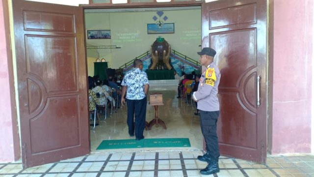 Tribratanews.polrestanimbar.com – Polda Maluku, Polres Kepulauan Tanimbar, di Gedung Gereja Imanuel Jemaat GPM desa Adaut, kecamatan Selaru, kabupaten kepulauan Tanimbar, Bhabinkamtibmas desa Adaut Bripka Y. Djilarpoin hadir mengamankan jalannya Ibadah Minggu, (16/10).