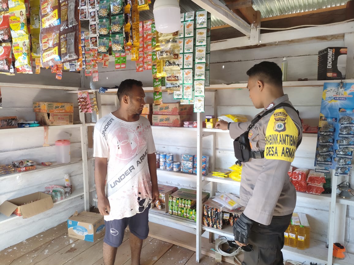Tribratanews.polrestanimbar.com – Polda Maluku, Polres Kepulauan Tanimbar, menindaklanjuti Perintah Kapolres Kepulauan Tanimbar tentang larangan Minuman Keras, Bhabinkamtibmas Desa Arma Bripka E.R.Tutupary Mengunjungi Kios Dua Kembar Milik Bapak Demis Masela yang Bertempat di  Desa Arma, Kecamatan Nirunmas, Kabupaten Kepulauan Tanimbar, Rabu (19/04).