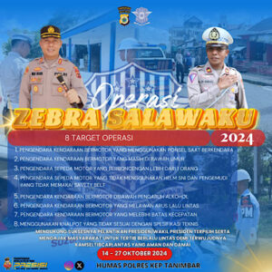 “Operasi Zebra Salawaku 2024 ini adalah merupakan jenis Operasi Harkamtibmas bidang lalu lintas yang mengedepankan kegiatan edukatif dan persuasif, serta didukung Gakkum Lantas secara elektronik baik statis maupun mobile dan teguran simpatik ” pungkasnya.