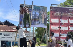 Imbau Stop Miras, Bhabinkamtibmas bersama Perangkat Desa pasang Spanduk Imbauan