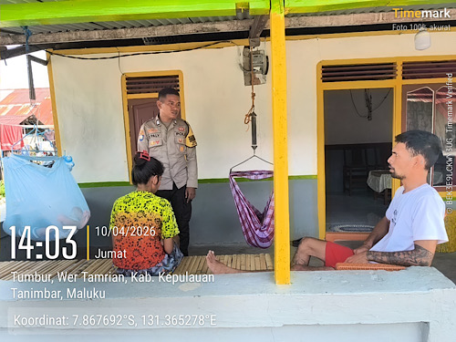 Tribratanews.polrestanimbar.com – Polda Maluku, Kepolisian Resor Kepulauan Tanimbar, Dalam upaya menjaga stabilitas keamanan dan ketertiban Masyarakat (Kamtibmas), Bhabinkamtibmas Desa Tumbur, Brigpol V. P. PALY melaksanakan kegiatan sambang melalui metode Door to Door System (DDS) di kawasan Jl. Mangkawar, Desa Tumbur, Kecamatan Wertamrian, Jumat (10/04/26).