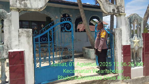 Seperti yang dilakukan oleh Bhabinkamtibmas Desa Kilon, Polsek Wuarlabobar, Bripka HANS. USA. T. LUARWAN dalam melakukan pengamanan saat pelaksanaan Ibadah Sholat Jumat Berjamaah yang berlangsung pada Masjid Baitul Makmur di Desa Kilon, Kecamatan Wuarlabobar, Kabupaten Kepulauan Tanimbar, Jumat (01/08/25).