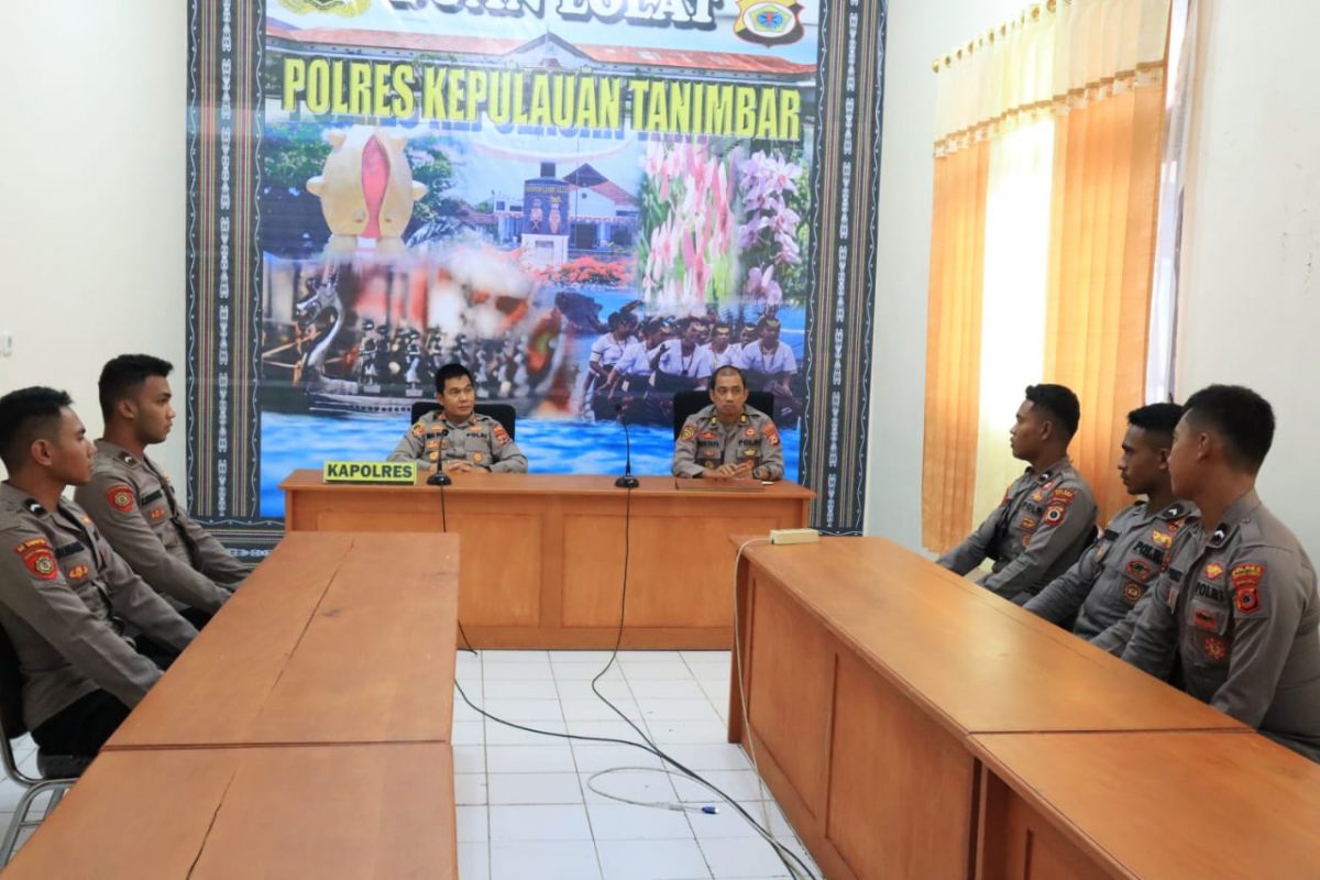 Tribratanews.polrestanimbar.com – Polda Maluku, Polres Kepulauan Tanimbar, Kapolres Tanimbar AKBP Umar Wijaya, S.I.K., didampingi Kabag SDM AKP Mustafa Kamal, S.Sos., berikan Pembekalan tugas kepada Bintara Polri lulusan Rekpro diruang Vicon Polres. Selasa (10/05/2022).