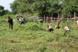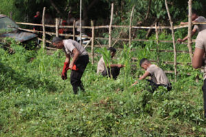 Mengingat, saat ini intensitas curah hujan yang tinggi dan rumput liar pun mulai tumbuh. Sehingga, lewat budaya gotong royong tampak seluruh Personel saling bekerja sama untuk membersihkan seluruh area yang telah ditumbuhi rumput liar dengan menggunakan alat yang telah dipersiapkan.