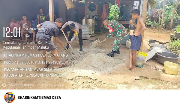 Seperti yang tampak dilakukan oleh Bhabinkamtibmas Desa Lermatang, Polsek Tanimbar Selatan Bripka MARIO UREN bersinergi dengan Babinsa Sertu O. LETELAY dalam membantu pekerjaan pembangunan pondasi rumah milik Warga di Desa Lermatang, Kecamatan Tanimbar Selatan, Kabupaten Kepulauan Tanimbar, Senin (03/03/25).