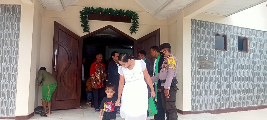 Tribratanews.polrestanimbar.com – Polda Maluku, Polres Kepulauan Tanimbar, di Gereja Protestan Maluku (GPM) Fwinin Lanratwe Wermatang, kecamatan Wermaktian, kabupaten kepulauan Tanimbar Bhabinkamtibmas desa Wermatang Briptu A. Wali melaksanakan kegiatan Pengamanan Ibadah Minggu oleh Jemaat desa Wermatang yang dipimpin oleh Penatua O. S. Hoinikore, Minggu (02/10/2022).
