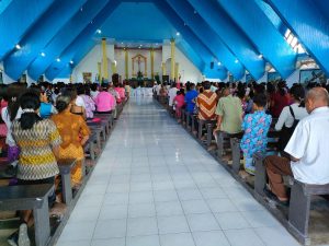 Pemimpin dalam kegiatan Misa / Ibadah Pastor RD. Poncio Ongirwalu dengan jumlah Umat yang menghadiri Ibadah sekitar 200 orang.