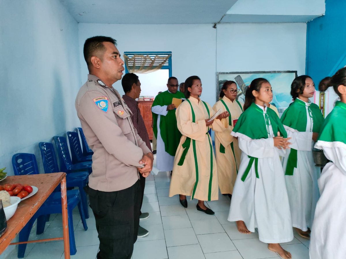 Tribratanews.polrestanimbar.com – Polda Maluku, Polres Kepulauan Tanimbar, Bhabinkamtibmas desa Wowonda Bripka S. Nusmese, S.H., mengikuti sekaligus amankan Misa / Ibadah minggu biasa XXII pada Gereja Katholik St. Maria Imaculatta desa Wowonda, Kecamatan Tanimbar Selatan, Kabupaten Kepulauan Tanimbar. Minggu (28/08).