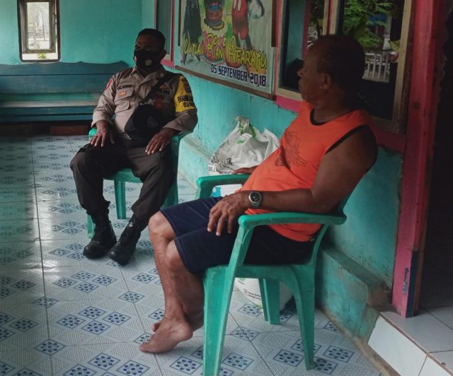 Tribratanews.polrestanimbar.com – Polda Maluku, Polres Maluku Tenggara Barat, Sabtu 05 Desember 2020, pukul 13.45 wit bertempat di Desa Adodo Molu Kecamatan Molu Maru Kabupaten Kepulauan Tanimbar Bhabinkamtibmas Desa Adodo Molu Bripka Glend Kasale melaksanakan giat sambang kepada Bapak Wellem Afaratu  masyarakat Desa Adodo Molu, sekaligus melaksanakan Pendisiplinan protokol kesehatan pencegahan penularan Covid-19 kepada warga yang tidak taat terhadap protokol kesehatan.