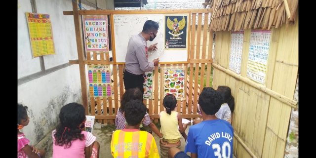 Bhabinkamtibmas melaksanakan program membaca anak dengan inofasi sendiri dalam rangka mencerdaskan anak bangsa ditengah pandemi Covid-19.