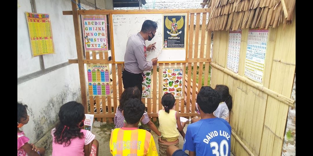 Tak lupa bhabinkamtibmas memberikan pengenalan huruf dan angka bagi yang belum kenal huruf dengan baik, sehingga dalam proses mengajar yang diajarkan oleh bhabinkamtibmas bisa membuahkan hasil yang baik dalam menuju Indonesia Cerdas dalam situasi pandemi Covid-19.