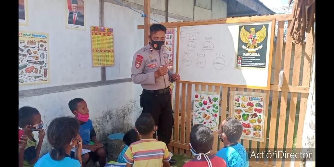 Kegiatan Proses Belajar Mengajar bagi anak di tengah Pandemi Covid -19 yakni memberikan motifasi mereka untuk semangat belajar membaca dan menulis bagi yang belum bisa membaca dan menulis dengan lancar, tak lupa Bhabinkamtibmas mengarahkan anak-anak ini untuk membaca buku di perpustakaan dalam rangka menambah pengetahuan selain pelajaran yang didapat di Sekoah, agar kedepan anak-anak ini putus sekolah. Tak lupa pula Bhabinkamtibmas juga mengajarkan Tata Cara Protokol Kesehatan Pencegahan Covid-19 kepada anak-anak ini yakni selalu pakai masker apabila ke sekolah, rajin mencuci tangan sebelum makan, dan menjaga jarak antara satu dengan yang lain.