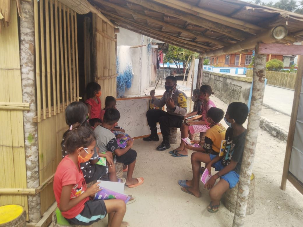 Tribratanews.polrestanimbar.com – Polda Maluku, Polres Maluku Tenggara Barat, Senin 12 Oktober 2020, pukul 10.00 wit, bertempat di perpustakaan bhabinkamtibmas anak amdasa wilitabun Kecamatan Wertamrian Kabupaten Kepulauan Tanimbar Bhabinkamtibmas Desa Amdasa Aipda J. I. M. Manullang melaksanakan inovasi program belajar anak melalui perpustakaan bhabinkamtibmas untuk menuju Indonesia pintar ditengah pandemi selama aktifitas sekolah diliburkan sampai dengan saat ini, bhabinkamtibmas memberikan program pengenalan huruf serta menulis bagi anak yang belum bisa menulis dan membaca, sehingga kurun waktu 2 (dua) bulan ini mereka sudah dapat mengenal huruf dan membaca dengan perlahan lahan dengan adanya program belajar anak didesa yang dilakukan oleh bhabinkamtibmas guna mengurangi aktifitas bermain anak-anak didesa ditengah situasi pandemi Covid 19.