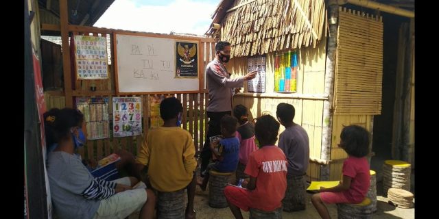 Tribratanews.polrestanimbar.com – Polda Maluku, Polres Maluku Tenggara Barat, Rabu, 16 Desember 2020, pukul 11.30 wit, bertempat di Taman Baca Kemala Bhabinkamtibmas Kecamatan Wertamrian Kabupaten Kepulauan Tanimbar Bhabinkamtibmas Desa Amdasa Aipda J.I.M. Manullang bhabinkamtibmas melaksanakan program belajar mengajar anak dalam rangka memberikan dorongan untuk mencerdaskan anak bangsa serta membuka peluang waktu belajar membaca anak-anak ditengah-tengah pandemi Covid-19, guna mengurangi waktu bermain anak-anak didesa.