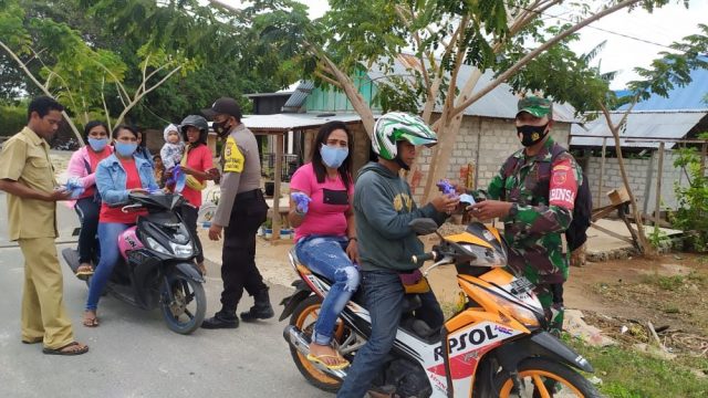 Selanjutnya Sekdes, Bhabinkamtibmas dan Babinsa membagikan masker dan sarung tangan kepada warga.