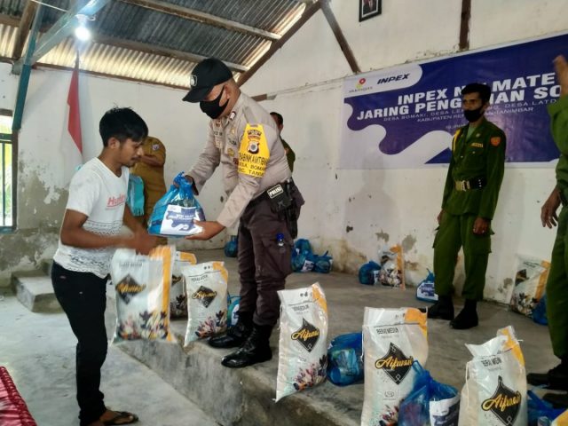 Tribratanews.polrestanimbar.com – Polda Maluku, Polres Maluku Tenggara Barat, Selasa 28 Juli 2020, pukul 10.35 Wit bertempat di Desa Bomaki Kecamatan Tanimbar Selatan, Kabupaten Kepulauan Tanimbar, Bhabinkamtibmas Desa Bomaki Bripka S.E.S. Mitakda bersama Babinsa Bomaki Sertu Jhon R. Weniliwang melaksanakan Giat Pengamanan Pemberian Bantuan Sembako dari SKK Migas dan Inpex kepada Masyarakat Desa Bomaki