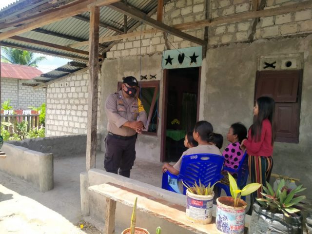 Bhabinkamtibmas menyampaikan arahan tentang Edukasi, Sosialisasi dan Himbauan Pendisiplinan penerapan protokol kesehatan pencegahan Covid-19 dan Adaptasi Kebiasaan Baru.