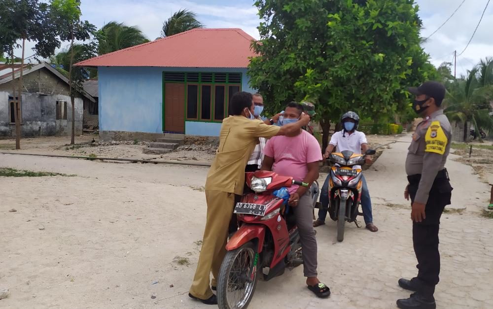 Setelah memberikan teguran selanjutnya Pemerintah Desa beserta Bhabinkamtibmas dan Babinsa memberikan masker kepada warga.