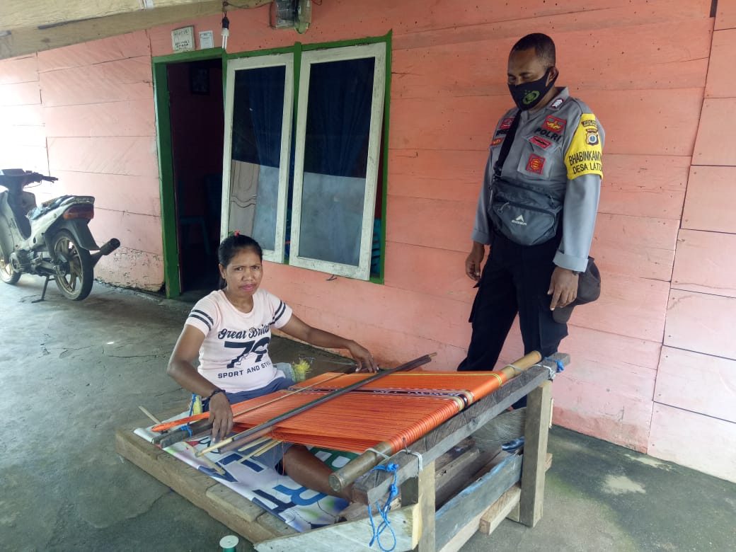 BRIPKA P. PEEA, SE, Menyambangi Ibu M. Refualu (Janda / pengrajin kain Tenun) Bhabinkamtibmas Langsung memberikan salam dan berbincang – bincang tentang kerajinanya serta memberikan masukan untuk mengembangkan Usaha pengrajinya lebih meningkat agar di perdagangkan ke kota Saumlaki maupun ke luar Daerah KKT