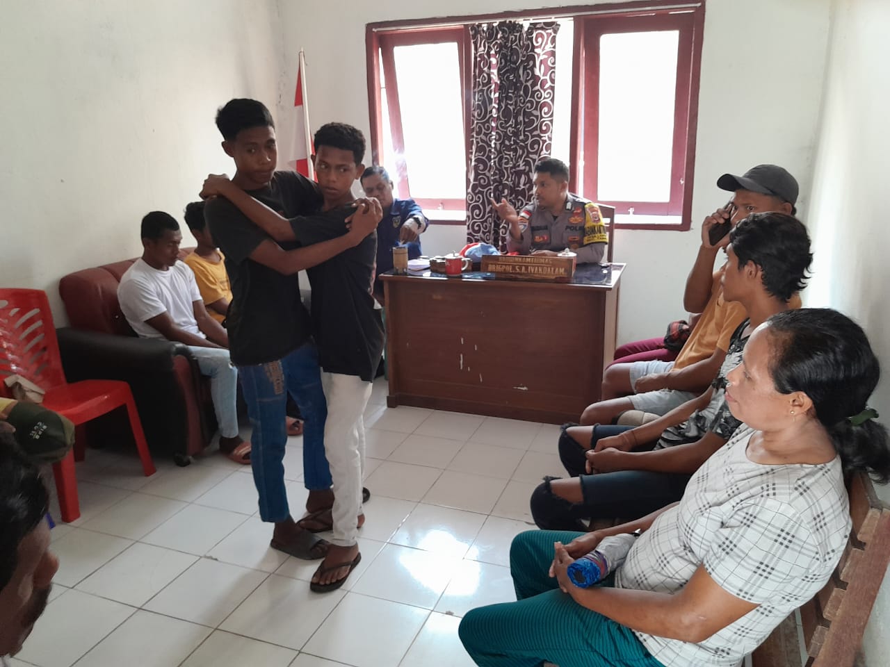 Bhabinkamtibmas Desa Lauran membantu Warga Binaannya menyelesaikan masalah melalui Problem Solving terkait Dugaan tindak pidana Kekerasan bersama dan kekerasan terhadap Anak dibawah umur yang diduga dilakukan oleh VK (20), SS (20) dan HK (24), WS (14) terhadap diri pelapor EE (22) dan YS (14) yang berlokasi di Tempat Bilyard dan Depan Gereja Desa Lauran Kecamatan Tansel, Kabupaten Kepulauan Tanimbar.