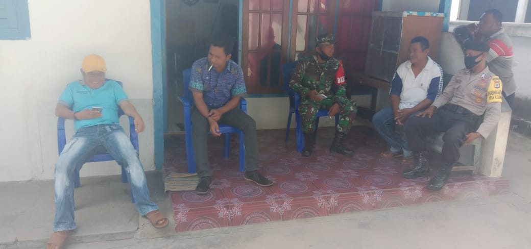 Bhabinkamtibmas Desa Lelingluan BRIPKA S.H.KELMASKOSU, Melaksanakan giat sambang bersama Babinsa Serda A. Elyawar kepada beberapa warga yang sementara duduk di depan rumah dari keluarga Bapak Jhon Ibur.