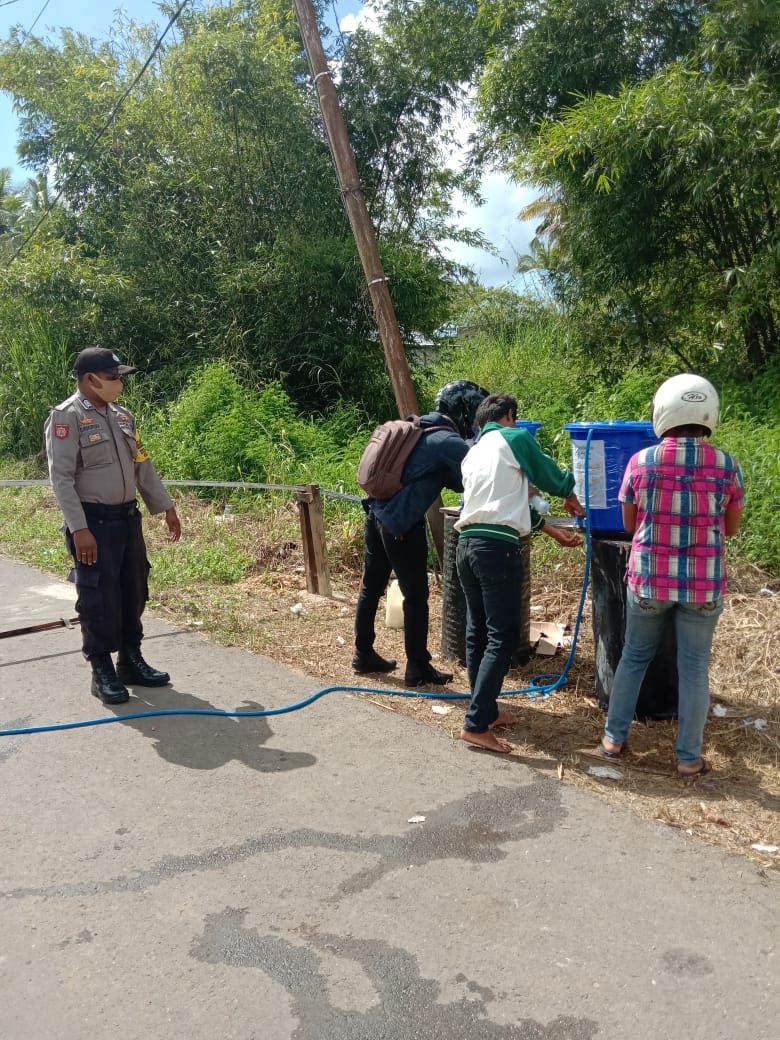 Bhabinkamtibmas mengajak warganya, baik yang akan keluar Desa maupun yang baru datang, untuk mencuci tangan dengan sabun pada air yang telah disediakan pada posko Covid 19 Desa Lorulun.