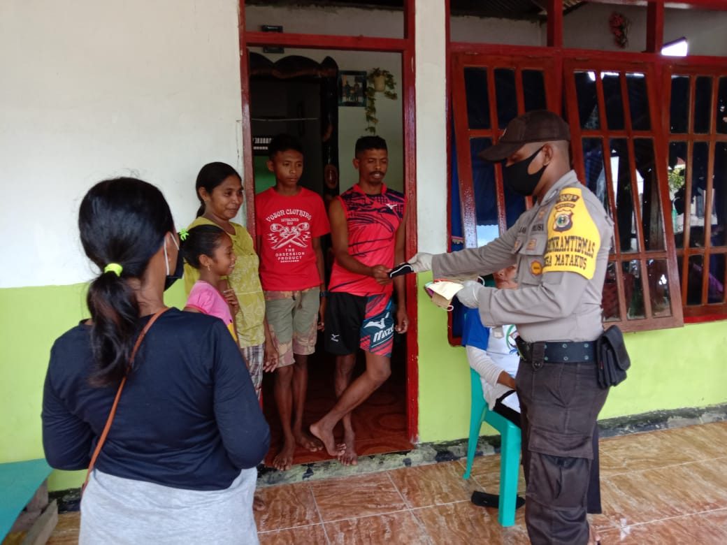 Sementara itu Bhabinkamtibmas juga membagikan masker kepada beberapa warga Desa Matakus pada RT.01.