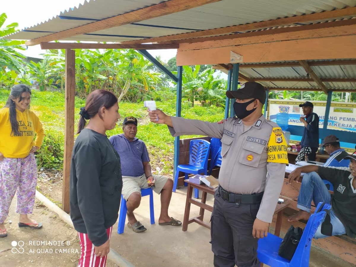 Bhabinkamtibmas saat menyambangi Posko Tim Relawan yang sementara melaksanakan piket pengawasan pada palang pintu masuk keluar dari dan menuju Desa Watidal, Bhabinkamtibmas membantu untuk mengecek langsung suhu tubuh bagi setiap orang/tamu yang masuk keluar Desa Watidal.