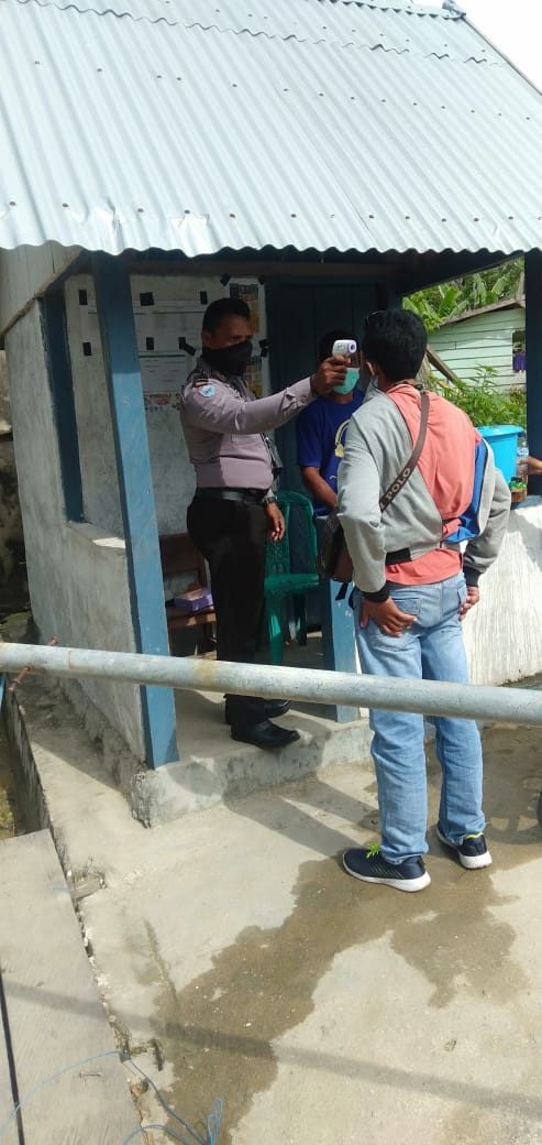 Beranda Berita Polres Bhabinkamtibmas Desa Wermatang Periksa Langsung Suhu Tubuh Setiap Warga Yang Masuk Di...