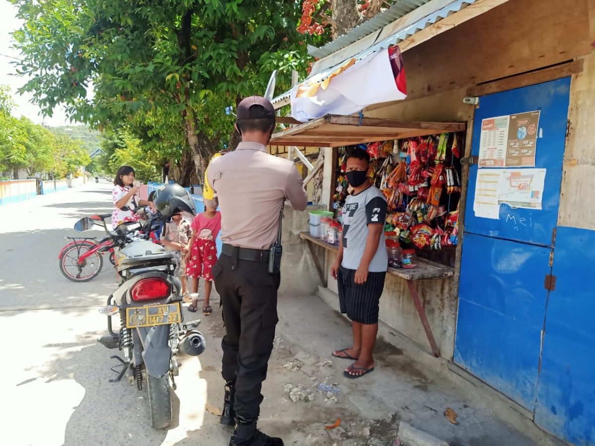 Bhabinkamtibmas menyambangi pemilik tempat usaha kios sembako dan menemukan ada pemilik tempat usaha yang tidak melaksanakan Protokol kesehatan pencegahan penyebaran dan penularan Covid-19 pada tempat usaha yakni pada tempat usaha belum disiapkan tempat air cuci tangan dan hand sanitizer serta masih ditemukan melayani pengunjung yang tidak menggunakan masker.