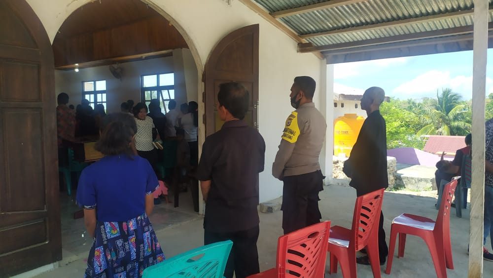 Tribratanews.polrestanimbar.com – Polda Maluku, Polres Maluku Tenggara Barat, Minggu 25 Oktober 2020, pukul 09.00 wit, bertempat di Gereja Bethel Jemaat GPM Lermatang Kecamatan Tanimbar Selatan Kabupaten Kepulauan Tanimbar Bhabinkamtibmas Desa Lermatang Briptu Tobias O. Daniel, S.H mengikuti dan mengamankan kegiatan Ibadah Minggu, dan yang bertindak sebagai Pengkhotbah/pemimpin Ibadah : Diaken R. Fordatkosu.