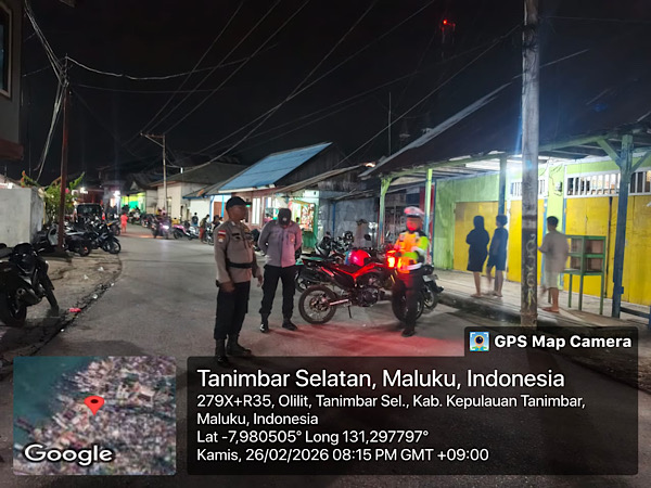 Tribratanews.polrestanimbar.com – Polda Maluku, Kepolisian Resor Kepulauan Tanimbar, Guna memberikan rasa aman dan nyaman bagi umat Muslim dalam menjalankan ibadah di Bulan Suci Ramadhan 1447 H / 2026 M, Bhabinkamtibmas Kelurahan Saumlaki, Bripka STEVEN KASTANYA melaksanakan kegiatan pengamanan (PAM) ibadah Sholat Tarawih di Masjid AN’NUR, Kelurahan Saumlaki, Kamis (26/02/26) malam.