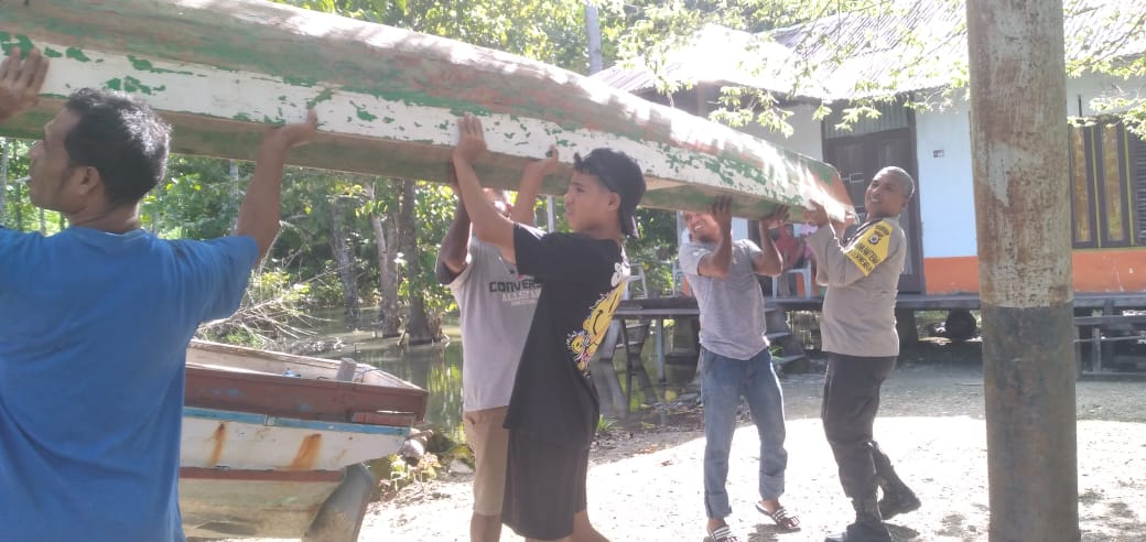 Pada kunjungannya tersebut, Bhabinkamtibmas turut Membantu Warga Binaannya yang sedang memindahkan sebuah Perahu untuk ditempatkan di Laut, Setya Bhabinkamtibmas memberikan apresiasi kepada warga Binaan yang telah membantu petugas dalam memelihara situasi kamtibmas dilingkungan tempat tinggal.