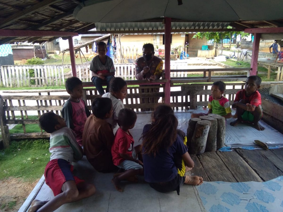 “Kepada adik – adik sekalian agar kurangi waktu bermain dan tingkatkan jam belajar baik di Sekolah maupun di rumah, sehingga ilmu yang di dapat bisa berguna untuk ade – ade untuk meraih masa depan.” Ucap Bhabinkamtibmas dalam kearifan lokal bahasa setempat sehingga mudah dipahami oleh anak – anak tersebut.