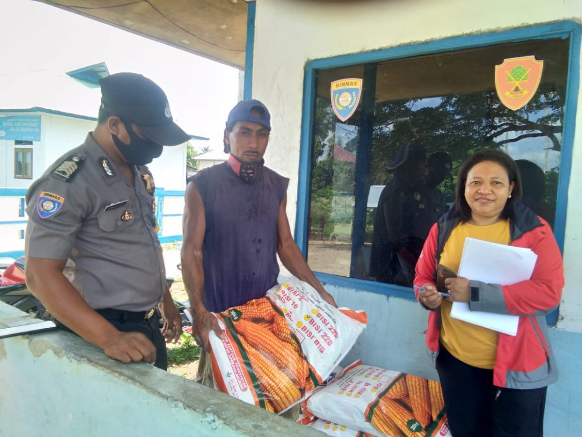 Tribratanews.polrestanimbar.com – Polda Maluku, Polres Maluku Tenggara Barat, Jumat 31 Juli 2020, pukul 09.00 wit, bertempat di Desa Marantutul, Kecamatan Wermaktian, Kabupaten Kepulauan Tanimbar Bhabinkamtibmas Desa Marantutul Bripka Fraly E. Lololuan melaksanakan pengamanan penyaluran Benih Jagung Super Hibrida dari Dinas Pertanian Kabupaten Kepulauan Tanimbar, Oleh  Ibu Yani Bahi (Ketua Koordinatar Kecamatan Wermaktian) Kepada Ketua Kelompok Pertanian Desa Marantutul Bapak Jemi Batlayery.