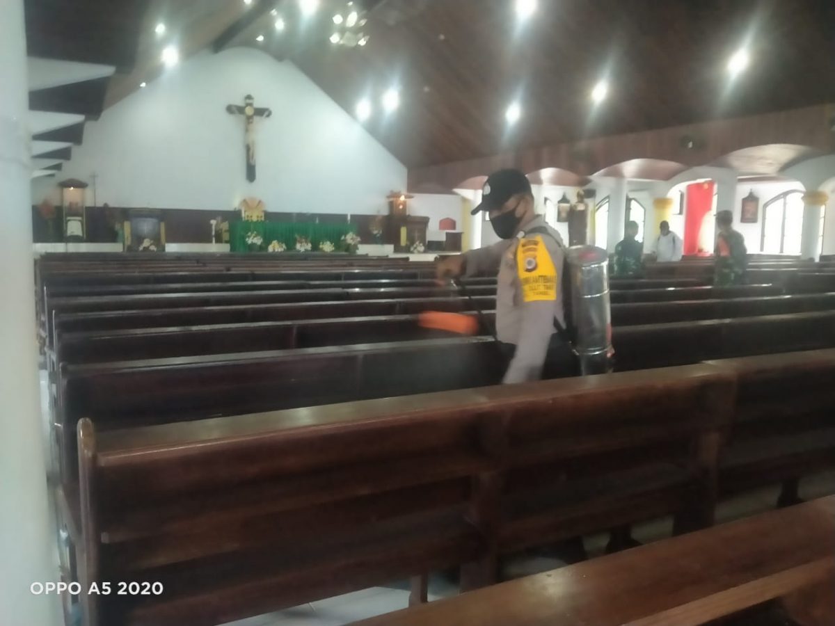 Tribratanews.polrestanimbar.com – Polda Maluku, Polres Maluku Tenggara Barat, Sabtu 06 Juni 2020, Jam 09.00 wit bertempat di Gereja Ratu Rosario Suci,  Desa Olilit Timur Kecamatan Tanimbar Selatan Kabupaten Kepulauan Tanimbar Bhabinkamtibmas Desa Olilit Timur BRIPKA ANTONIUS DASFAMUDI mendampingi sekaligus bersama dengan Tim Gabungan TNI-POLRI  melaksanakan Bakti Sosial berupa Penyemprotan Cairan  Desifektan  di Dalam Areal Tempat Ibadah dan Sekitarnya.