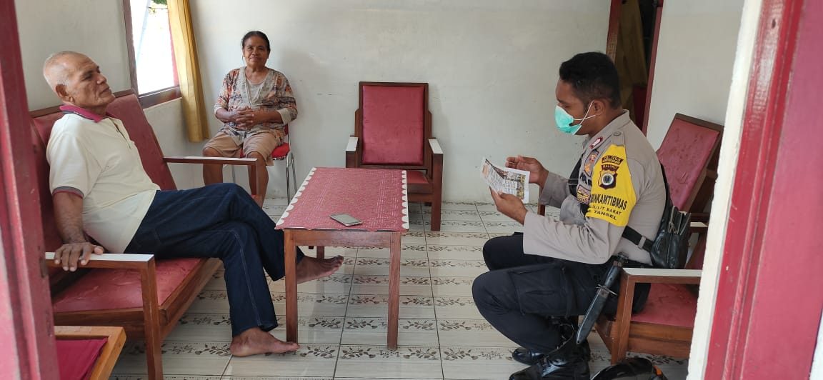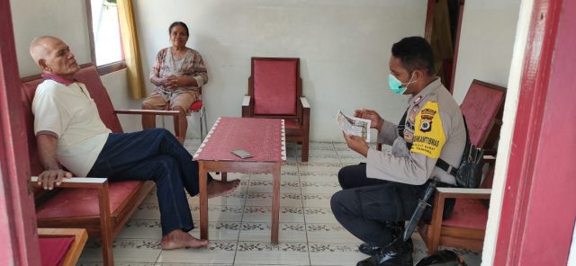 Dalam Kegiatan DDS kali ini Bhabinkamtibmas berkesempatan mensosialisasikan Maklumat Kapolri tentang Kepatuhan terhadap kebijakan Pemerintah dalam penanganan COVID – 19 kepada salah satu warga binaanya yakni Bapak Tomas Samangun bersama Isteri tepatnya pada kompleks RT 16 / RW 03 Desa Olilit Barat Kecamatan Tanimbar Selatan Kabupaten Kepulauan Tanimbar. Dalam kegiatan ini Bhabinkamtibmas juga menyampaikan beberapa point penting tentang Protokol Kesehatan dalam Pencegahan Penyebaran COVID-19 yakni :