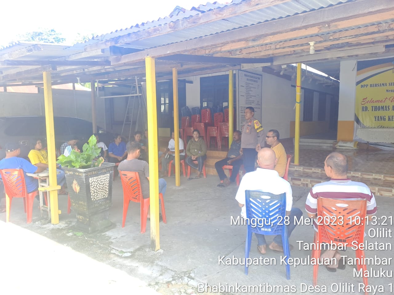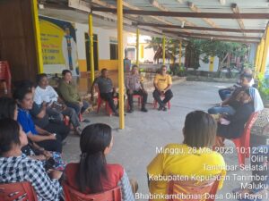 Tribratanews.polrestanimbar.com – Polda Maluku, Polres Kepulauan Tanimbar, Bhabinkamtibmas Desa Olilit Raya 1 Aipda Antonius Dasfamudi Melaksanakan kegiatan Duduk Bacarita Kamtibmas bersama para Tokoh di Desa binaannya, yang bertempat di Rumah Pastoran Gereja Katolik, Desa Olilit Raya 1, Kecamatan Tanimbar Selatan, Kabupaten Kepulauan Tanimbar,