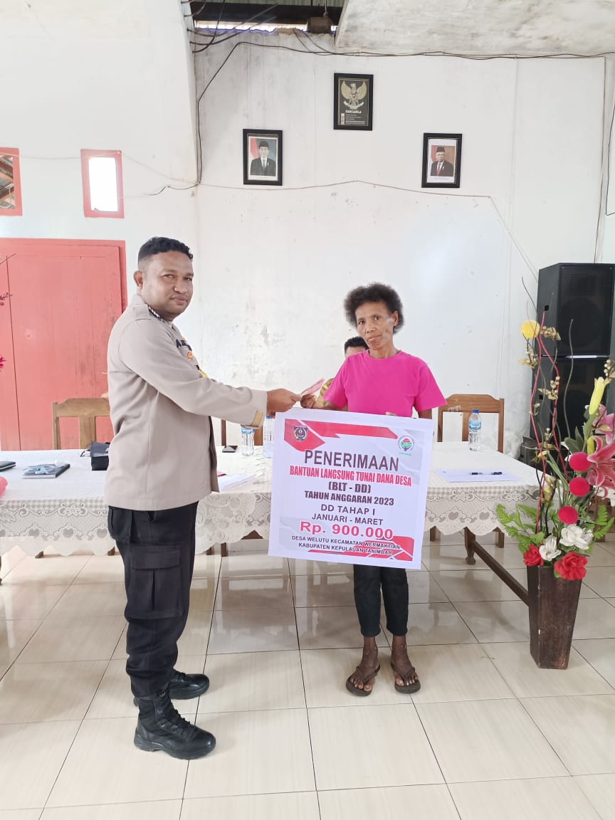 Tribratanews.polrestanimbar.com – Polda Maluku, Polres Kepuluan Tanimbar, Bhabinkamtibmas Desa Welutu Bripka Albert Huwae, S.P., melakukan pengamanan penyaluran Bantuan Langsung Tunai (BLT) yang bertempat di Balai Desa Welutu, Kecamatan Wermaktian, Kabupaten Kepulauan Tanimbar, Senin (19/06).