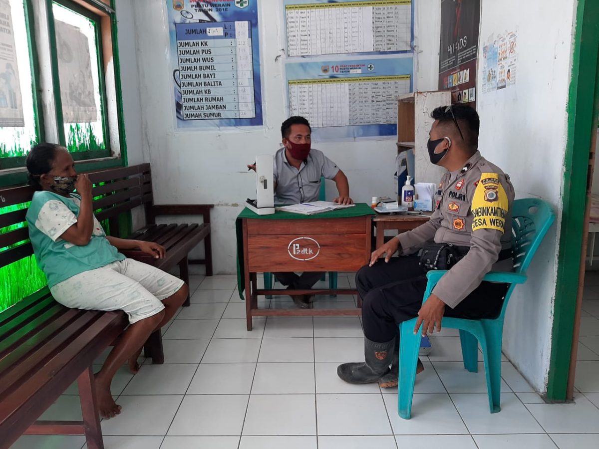 Tribratanews.polrestanimbar.com – Polda Maluku, Polres Maluku Tenggara Barat, Kamis 10 September 2020, pukul 10.00 wit, bertempat di Desa  Werain Kecamatan Selaru Kabupaten Kepulauan Tanimbar Bhabinkamtibmas Desa Werain Bripda Wanto Isran melaksanakan giat sambang pada Pustu Werain dan berkoordinasi dengan pihak Kesehatan setempat agar bersama dengan Staf Pemerintah Desa untuk menghimbau kepada seluruh Masyarakat Desa Werain agar untuk selalu mematuhi anjuran dari Pemerintah dan tetap berpedoman pada Protokol Kesehatan Pencegahan Covid-19 yakni Mencuci tangan dengan Sabun, Memakai masker pada saat bepergian, dan Menjaga Jarak.