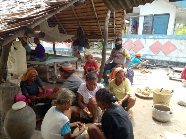 Tribratanews.polrestanimbar.com – Polda Maluku, Polres Maluku Tenggara Barat, Senin 28 September 2020, pukul 10.15 wit bertempat di Desa Werain Kecamatan Wertamrian, Kabupaten Kepulauan Tanimbar, Bhabinkamtibmas Desa Werain Bripda W. Isran menyambangi kelompok IRT yang sementara sibuk masak dalam rangka acara di Desa, dan menyampaikan arahan tentang Edukasi, sosialisasi dan himbauan tentang Pendisiplinan Penerapan Protokol Kesehatan Pencegahan Covid-19 dan Adaptasi Kebiasaan Baru.