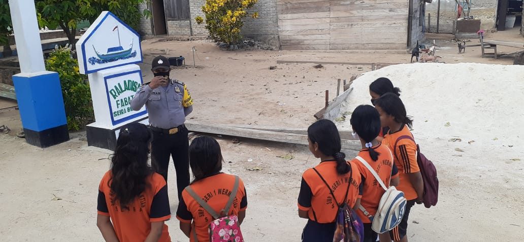 Tribratanews.polrestanimbar.com – Polda Maluku, Polres Maluku Tenggara Barat, Rabu 14 Oktober 2020, pukul 07.30 wit, bertempat di Pintu Masuk Desa Weratan Kecamatan Wermaktian Kabupaten Kepulauan Tanimbar Bhabinkamtibmas Desa Weratan Bripka Romanus Malirmasele melaksanakan giat sambang kepada para siswi SMP Negeri 1 Seira yang sementara berada di Pintu Masuk Desa Weratan tersebut, guna memberikan pembinaan Hukum kepada para siswi dimaksud, agar pada waktu belajar di sekolah harus berada di lingkungan sekolah bukan pada tempat yang sementara mereka berada.