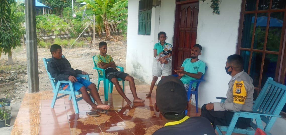 Bhabinkamtibmas menyambangi Para Pemuda Desa Wowonda yang sementara berkumpul di Rumah keluarga Bapak Yosep Refwalu. Pada saat giat Sambang tersebut Bhabinkamtibmas juga memberikan Bimbingan Penyuluhan tentang Adaptasi Kebiasaan Baru di Era Pandemi Covid-19 dengan maksud agar ketika beraktifitas Masyarakat senantiasa mempraktekan Protokol Kesehatan Pencegahan Covid-19.