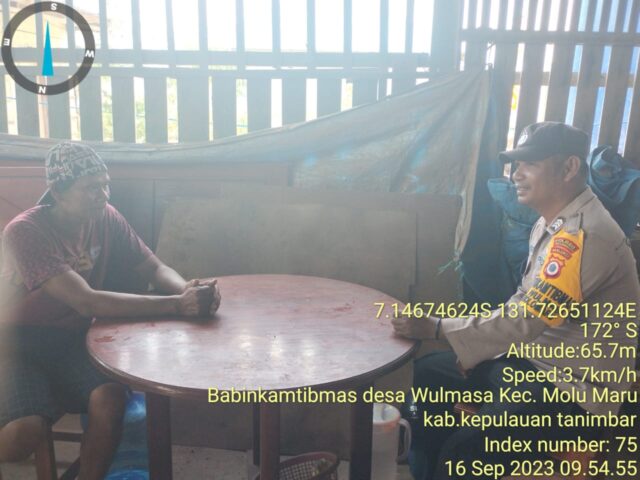 Kunjungan kepada Warga Binaannya tersebut berlokasi di RT 01 RW 02 Desa Wulmasa, Kecamatan Molu Maru, Kabupaten Kepulauan Tanimbar. Mengawalinya Bhabinkamtibmas memberikan Apresiasi kepada Warga Binaan yang telah membantu Bhabinkamtibmas dalam memelihara situasi kamtibmas di lingkungan tempat tinggal.