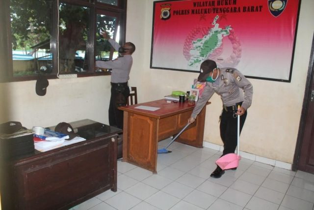 Salah satu upaya yang dilakukan oleh Satuan Binmas Polres Maluku Tenggara Barat adalah melaksanakan kegiatan kerja bakti membersihkan lingkungan maupun rungan kerja.Jumat (24/4/2020).