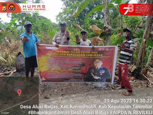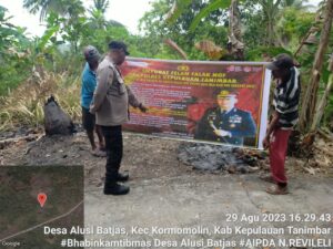 Menindaklanjuti perintah Kapolres Kepulauan Tanimbar, Bhabinkamtibmas Desa Alusi Batjas Aipda N. Refilely menyampaiakan Himbauan bagi warga Desa Alusi Batjas, Kecamatan Kormomolin, Kabupaten Kepulauan Tanimbar yang merupakan Petani terkait dampak buruk akibat terjadinya kebakaran Hutan dan Lahan.